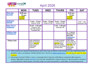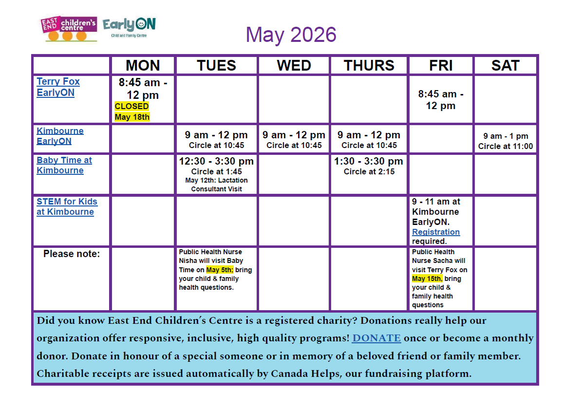 Kimbourne EarlyON: Tuesdays, Wednesdays, Thursdays 9 am – 12 noon and Saturdays 9 am – 1 pm; no programs July 1st, Aug 1st – 22nd, Dec 24th – 31st.