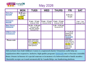 Terry Fox EarlyON: Monday and Friday, 8:45 – 12; capacity is 30 people; no programs February 16th, March 16th, March 20th, April 3rd, April 6th, May 18th, Aug 3 – 31st, Sept 7th, Oct 12th, Dec 21 – 31.