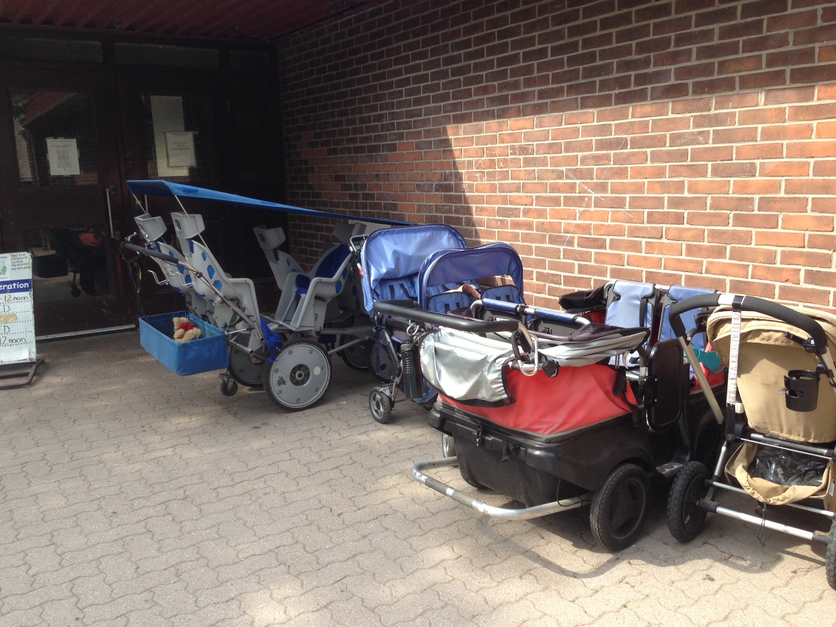 several large multi-child strollers are parked outdoors along a brick