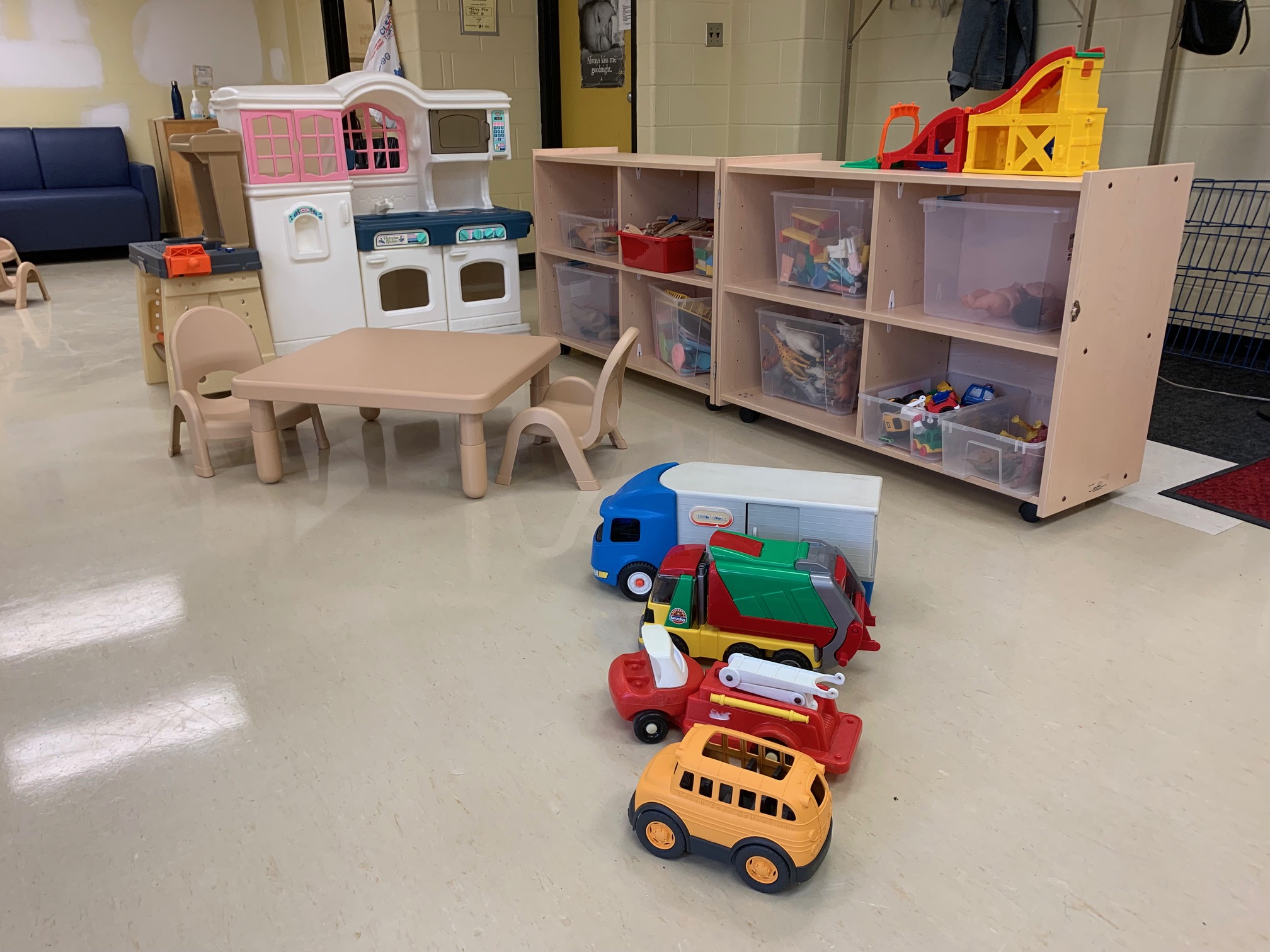 a children’s play area with several large toy trucks in the foreground and a play kitchen with a table and chairs and toys on a shelf in the background